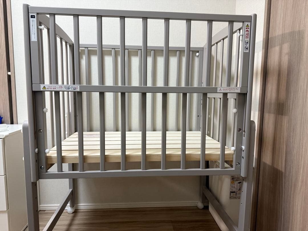 KATOJI カトージのベビーベッド、レギュラーサイズです!2024年12月に購入し、2025年1月から使用しています。赤ちゃんがあまりベビーベッドが好きではなく、通算3ヶ月ほどの使用です。見当たる傷は無く、非常に美品です。写真4枚目のスライドするドアの可動部に擦れがありますが、構造上発生してしまうものです。また、内側のためきになりません。品番02023W124×D78×H121cm内寸:120×70cm収納扉間口:W75.5×H34cm木製のオープンタイプベビーベッド、移動に便利なキャスター付き。- 素材: 木製- デザイン: オープンタイプのベビーベッド- キャスター: 移動可能なキャスター付き- サイズ: 標準的なベビーベッドサイズ- 側面: スラットデザインの側面ご覧いただきありがとうございます。カトージ KATOJI ベビーベッド#カトージ #KATOJI #ベビーベッド種別···ベビーベッド